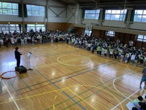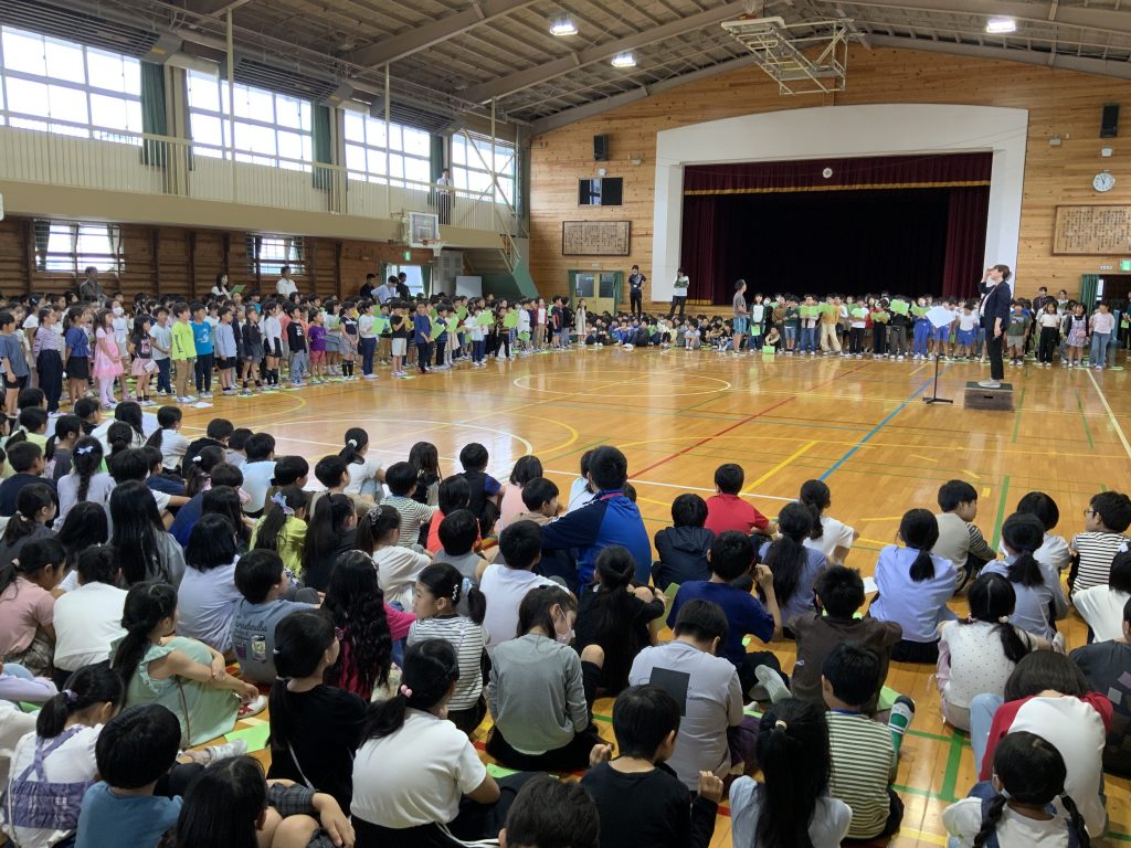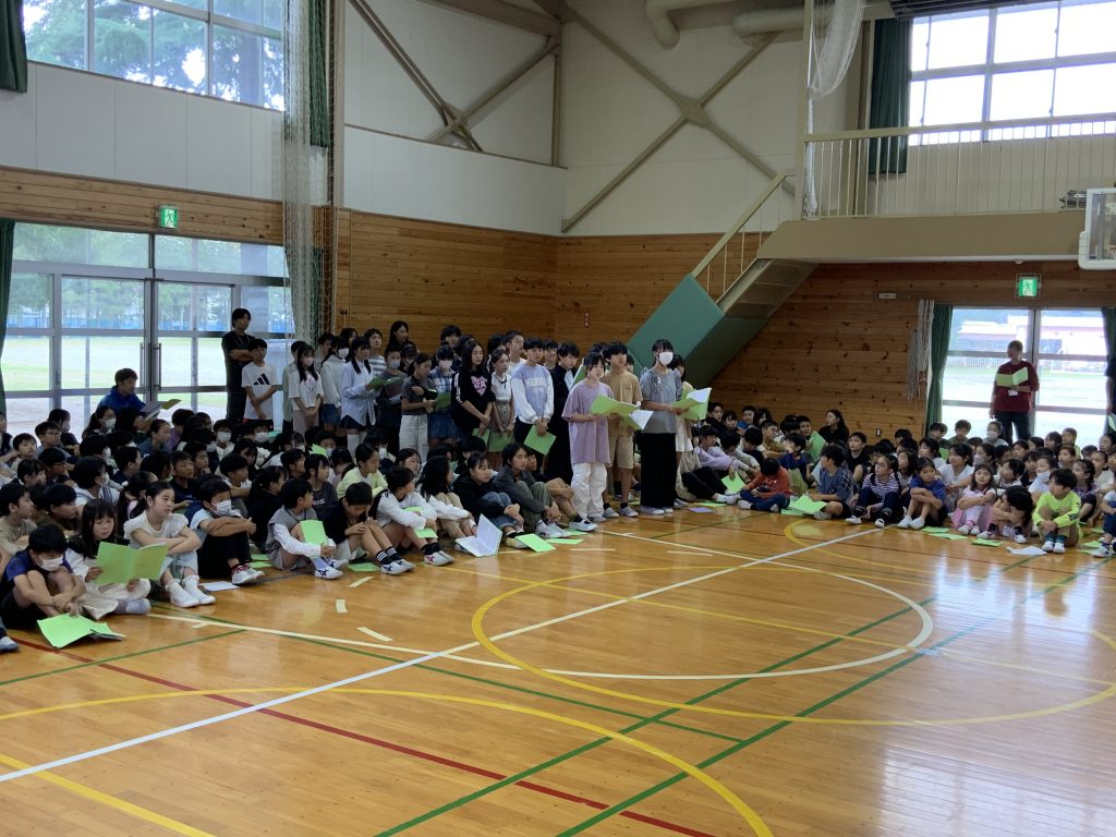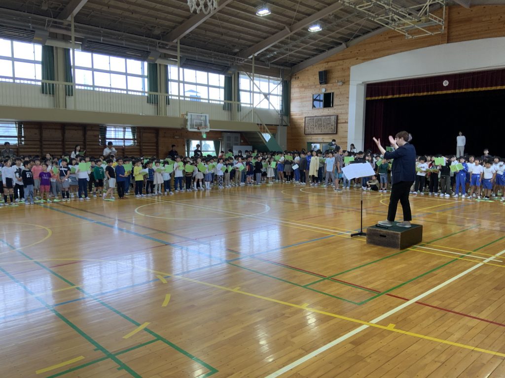 それぞれの旋律を聴き合ったあと、全校で合わせて歌ってみると、低い音から高い音まで、きれいなハーモニーが体育館いっぱいに響きました。