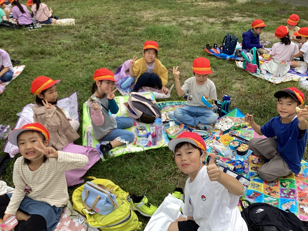 お昼ごはんは、グループ全員でシートを広げて食べる形式でした。周りのお友達と仲良くお弁当を囲み、「おにぎり美味しい!」「この卵焼きは自分で作ったんだよ」と会話が弾んだようです。