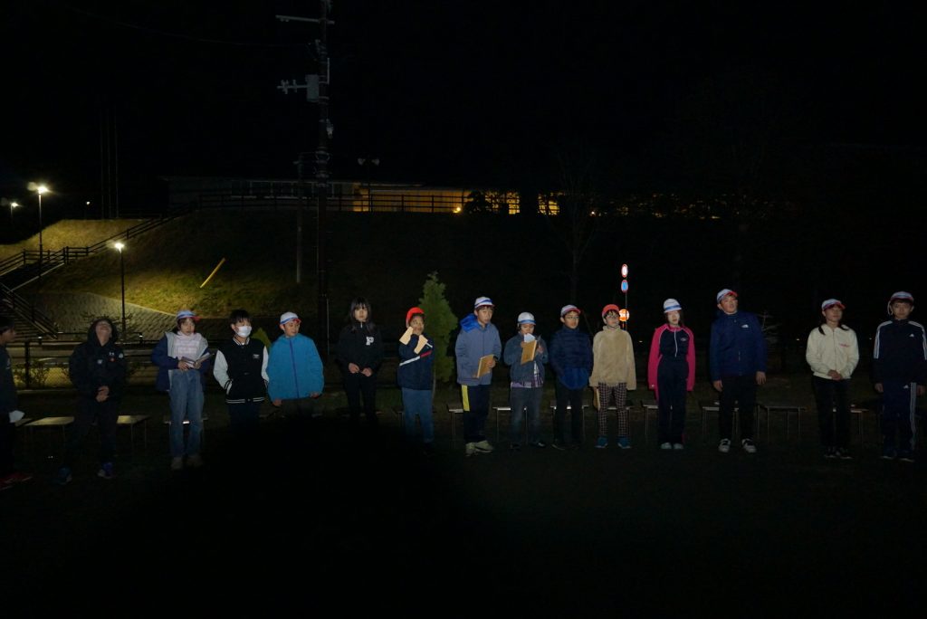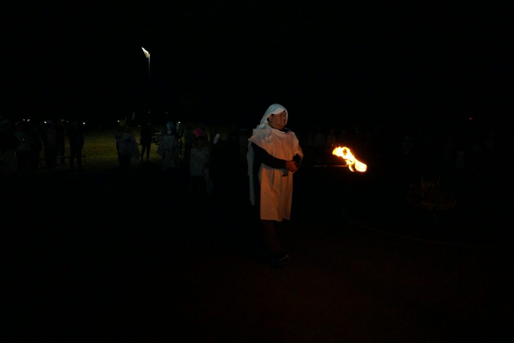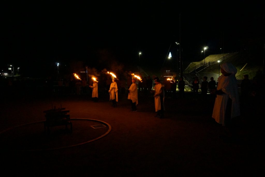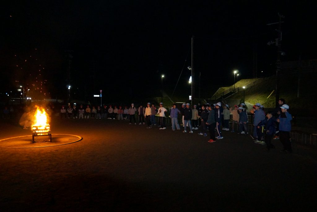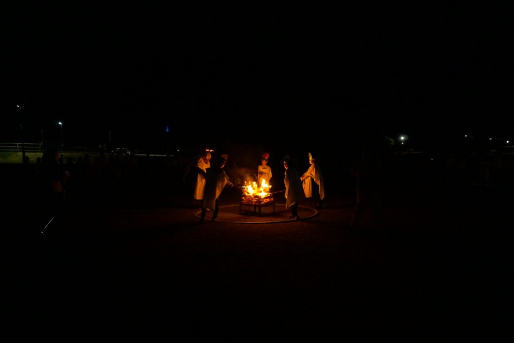 すっかり暗闇につつまれた19時、子供たちの歌う「遠き山に火は落ちて」が響くと、山の方から厳かに火の神と火の子が降りてきました。火の子の額には、それぞれ「協力」「仲間」「努力」「希望」が掲げられ、分火の儀式の際にはそれぞれ誓いが述べられました。