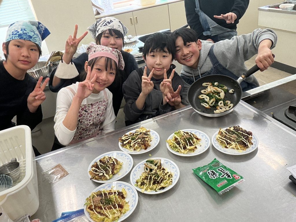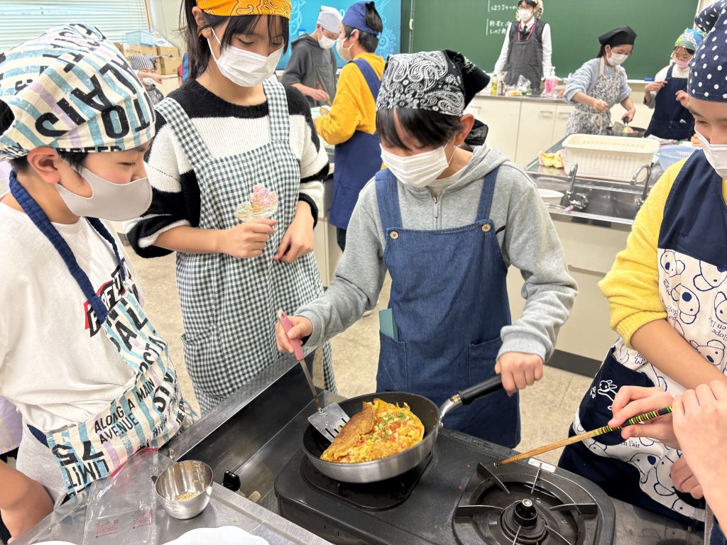 最後の調理実習は主菜・副菜のバランスを意識し、グループごとに献立を立てて取り組みました。肉じゃがやオムレツ、餃子、お好み焼きなど……。個性あふれるメニューが完成し、おいしそうなにおいが学校中に広がりました。